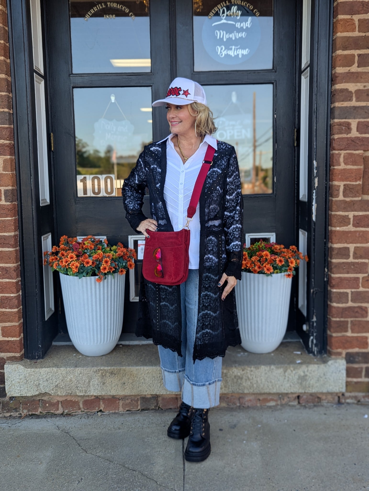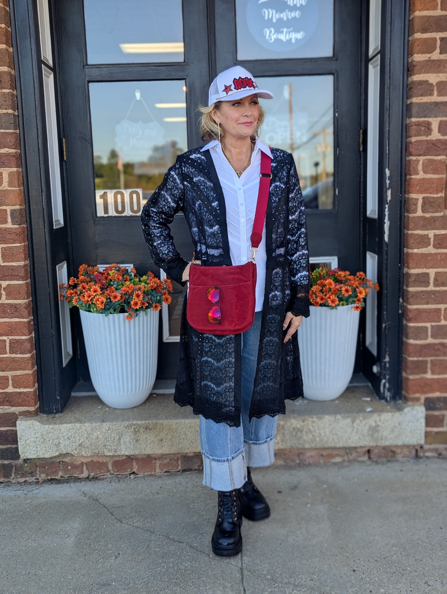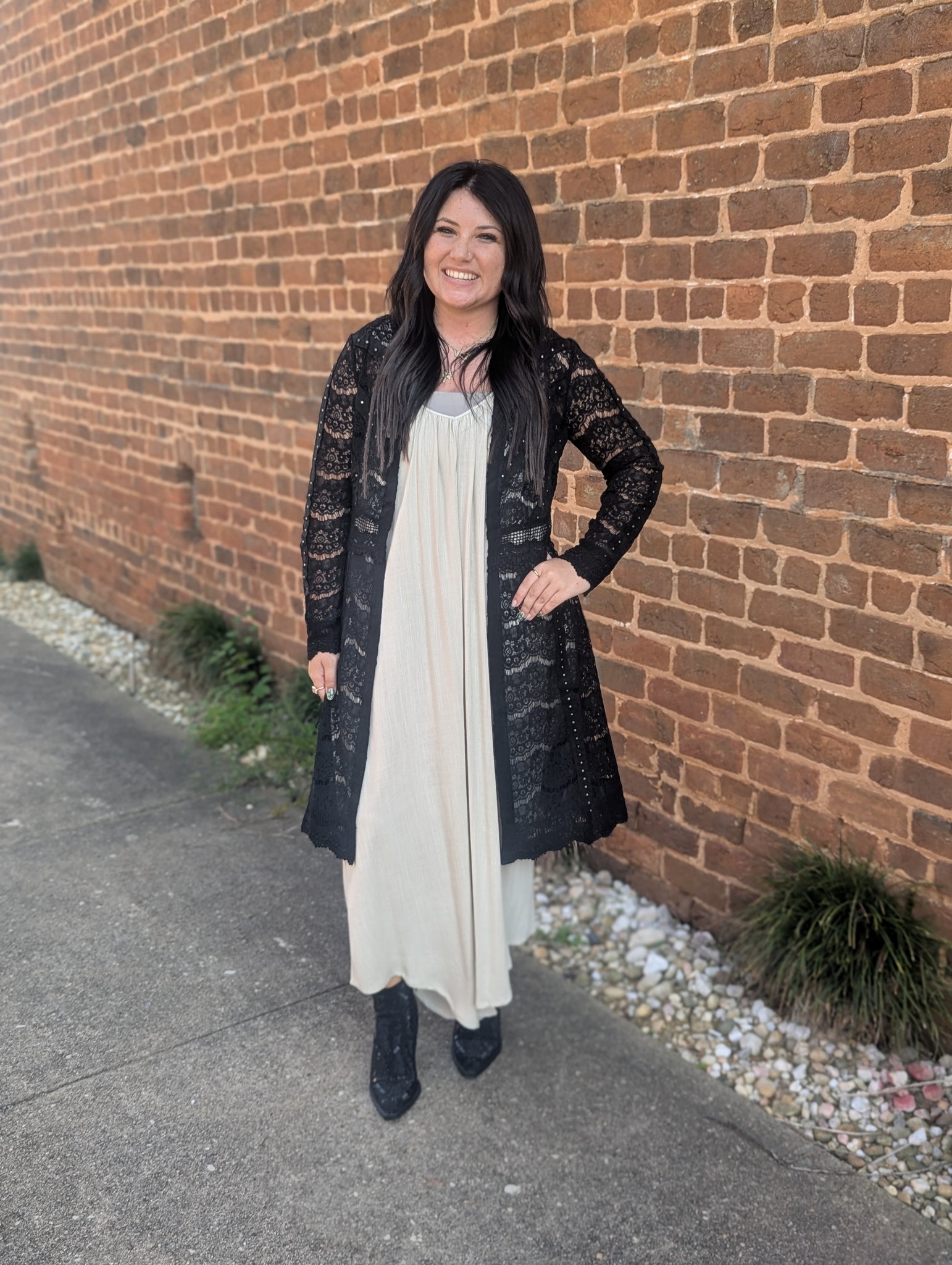 Elevate your look with the Black Lace and Stud jacket — a playful twist on classic elegance. This long sleeve piece features a delicate lace knit and a scalloped hem that adds flirty charm, while the open front design keeps it effortlessly chic. Studded details bring a subtle edge, making it perfect to wear from day to night with a touch of personality.