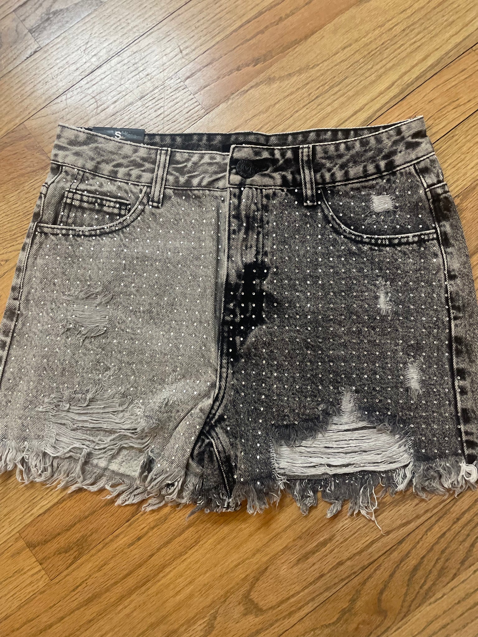 Elevate your casual style with our Black Two Tone Shorts. The contrasting denim creates a striking look, while the rhinestones add a touch of glamour. Perfect for any occasion, these shorts will make you stand out and feel confident. Upgrade your wardrobe and make a statement now!