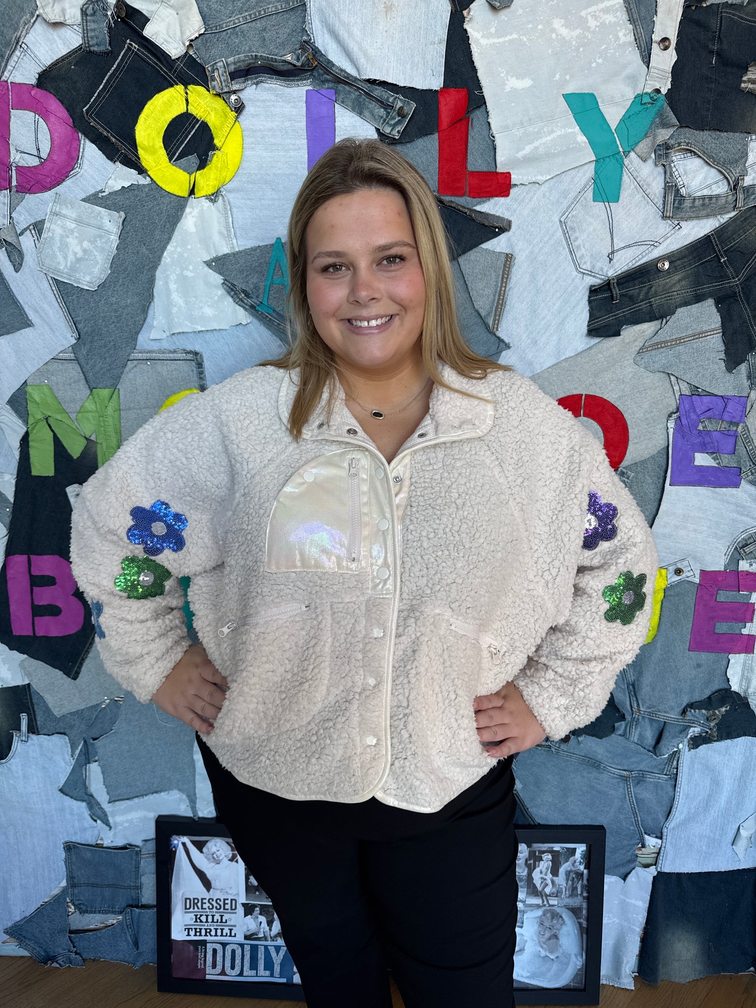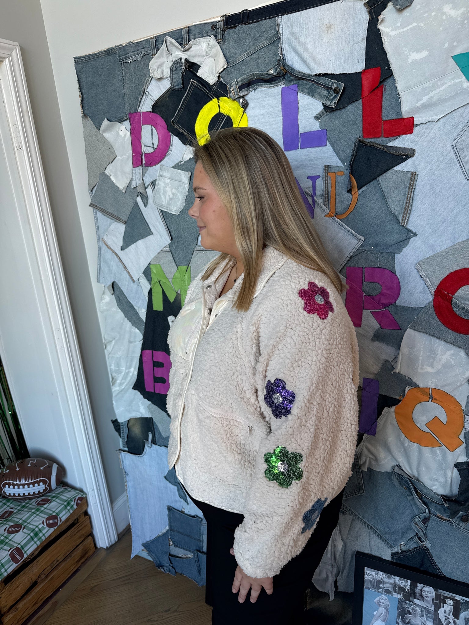 Stay cozy and stylish with our ivory sherpa, accented with delicate flowers. Enjoy the softness and warmth of sherpa while adding a feminine touch to your wardrobe. Perfect for a chilly day or a cozy night in, this sherpa is a must-have for any fashion-forward individual.