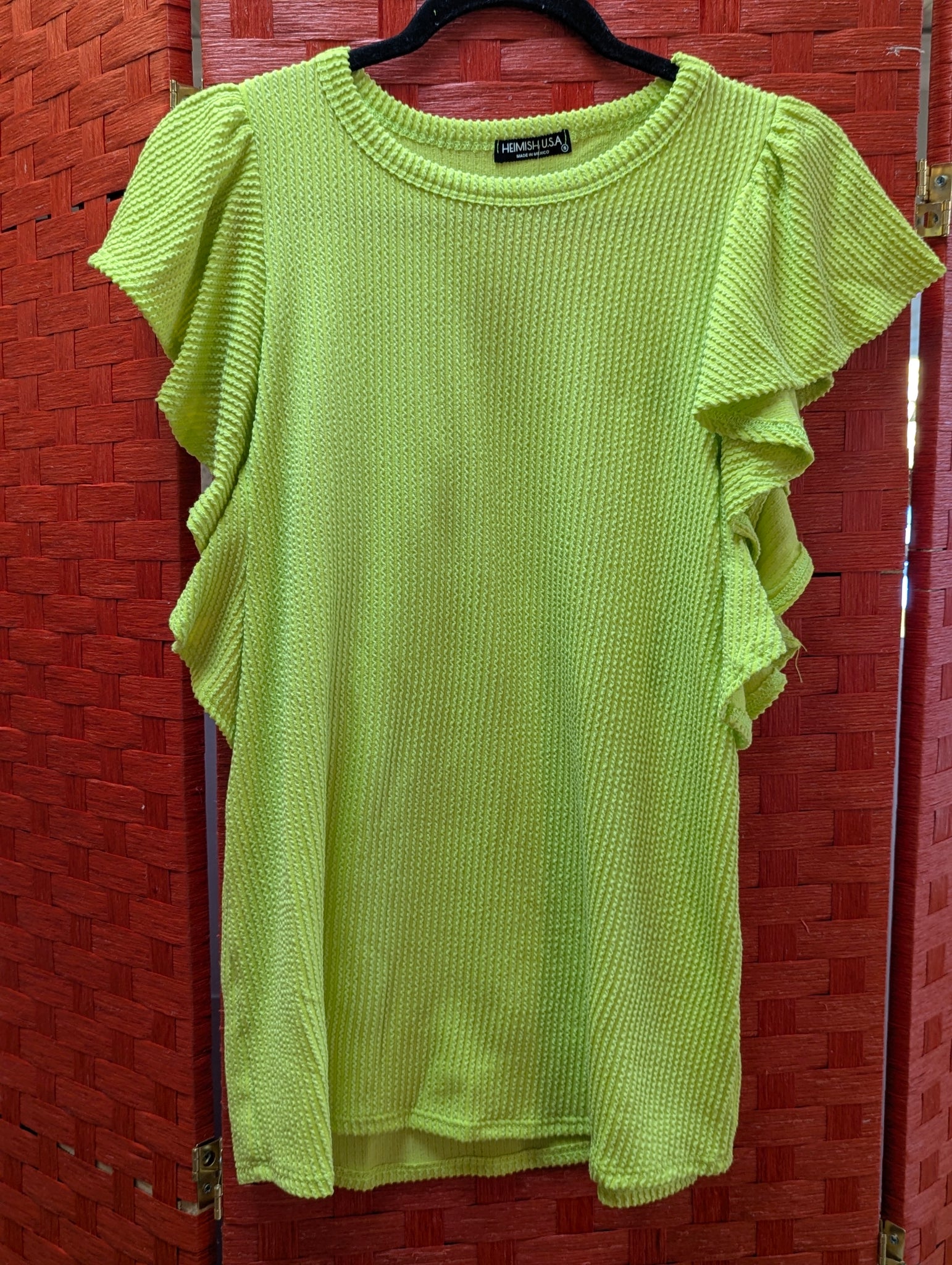 Lime ribbed top with a playful twist—short ruffled sleeves and a rounded hem that keeps things fresh and modern. The 95% polyester and 5% spandex blend gives you stretch and comfort without the fuss, while the solid urban vibe works with everything in your closet. Round neckline, structured ribbed fabric, and those signature ruffles make it the kind of piece you'll reach for again and again. Effortless style that actually moves with you.