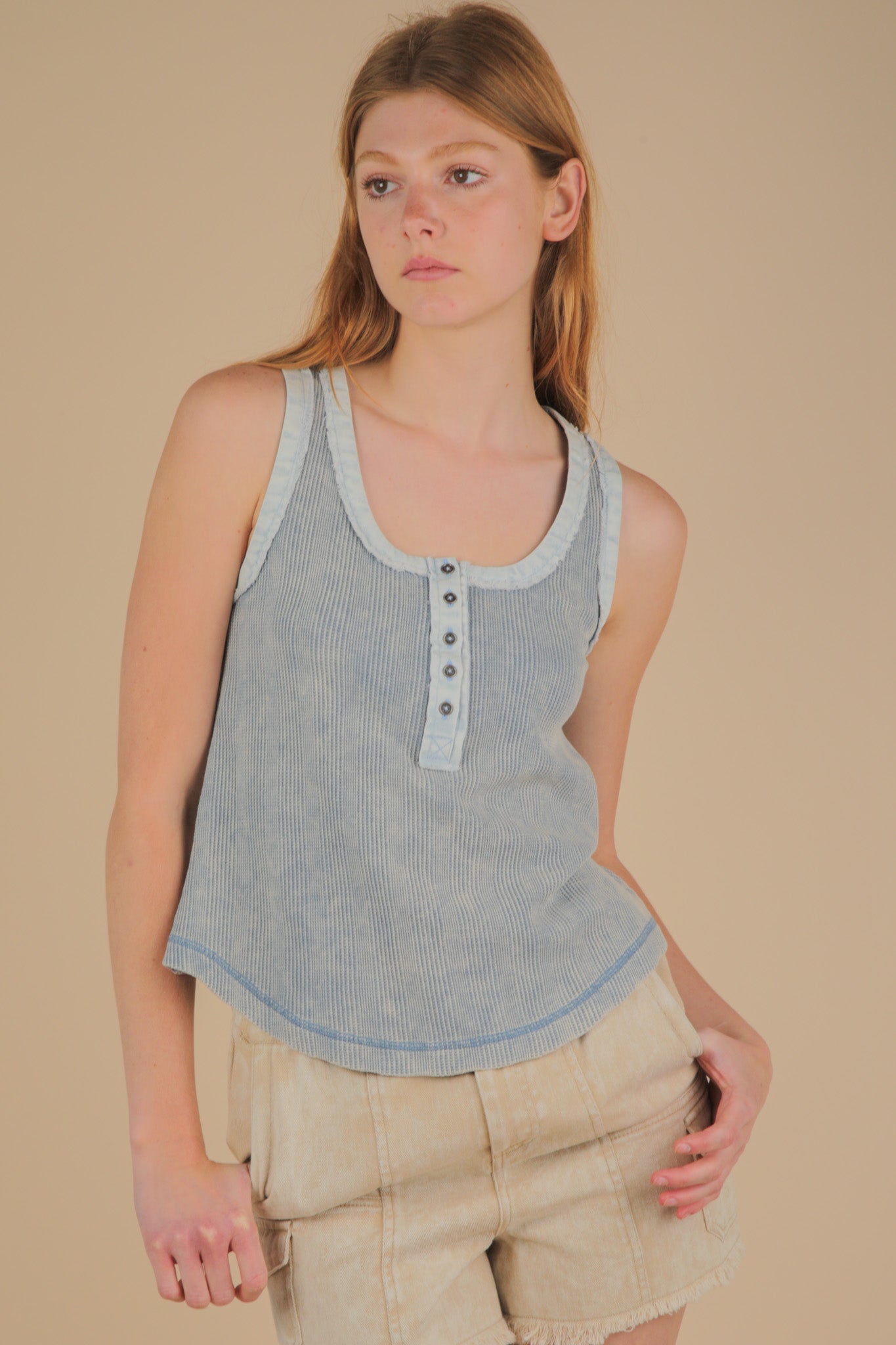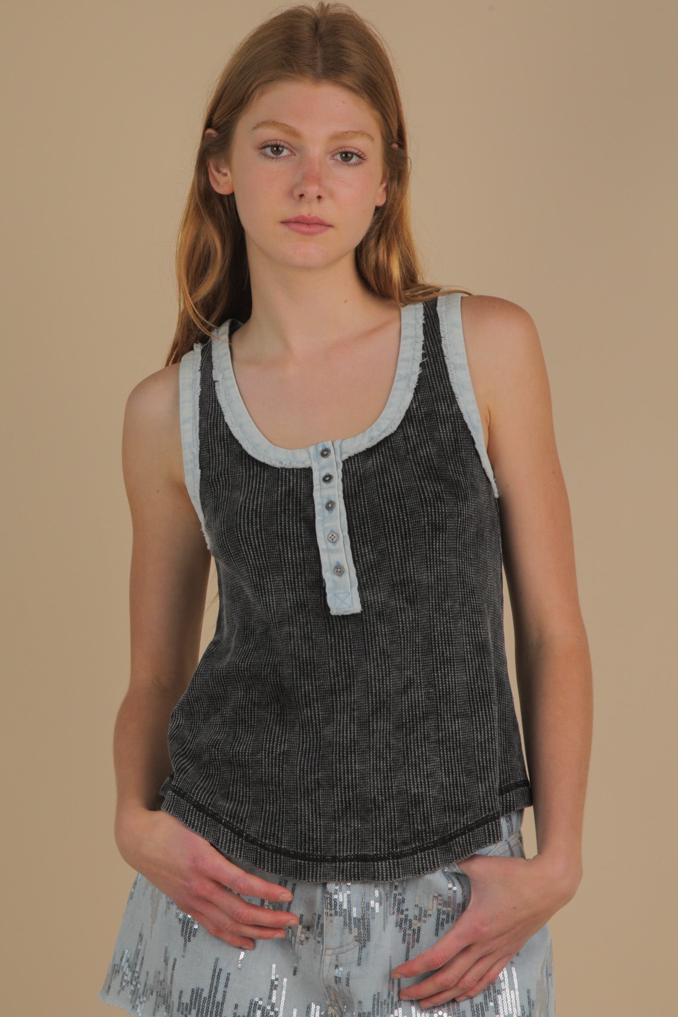 This playful tank top blends soft washed knit with cool denim contrast, making it a fun addition to your wardrobe. Featuring a half button-down front, a deep round neck, and a round hem, it offers a relaxed yet stylish fit. Sleeveless and breezy, it’s perfect for sunny days when you want to keep things light and lively.