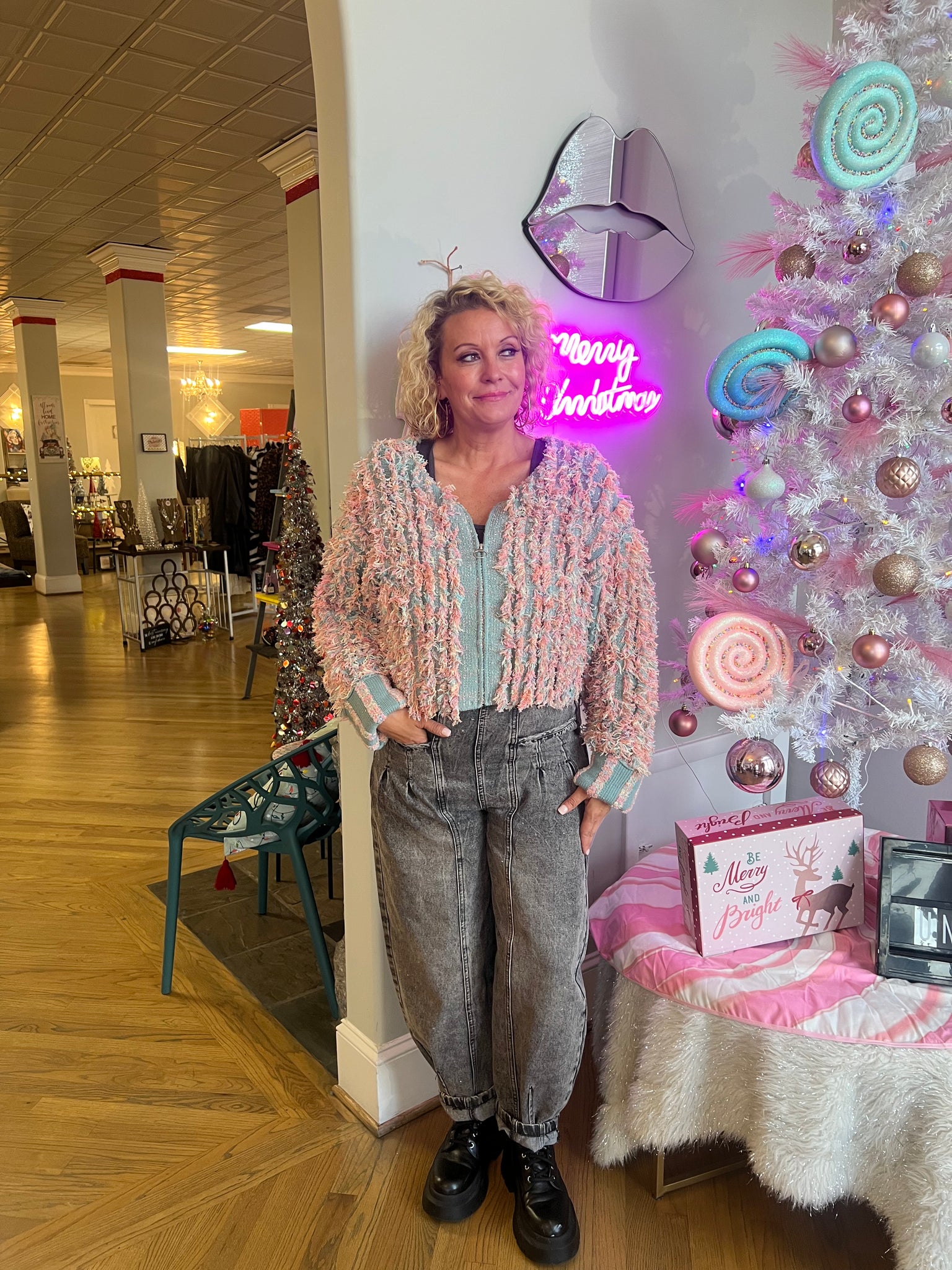 Wrap yourself in cozy fun with this Soft Shaggy Yarn Knit Sweater Jacket. Its oversized fit and drop shoulders give you laid-back comfort, while the round neck and zip-up front add easy, breezy style. Perfect for chilly days, this long-sleeve jacket is your go-to for festive layering with a playful twist.
