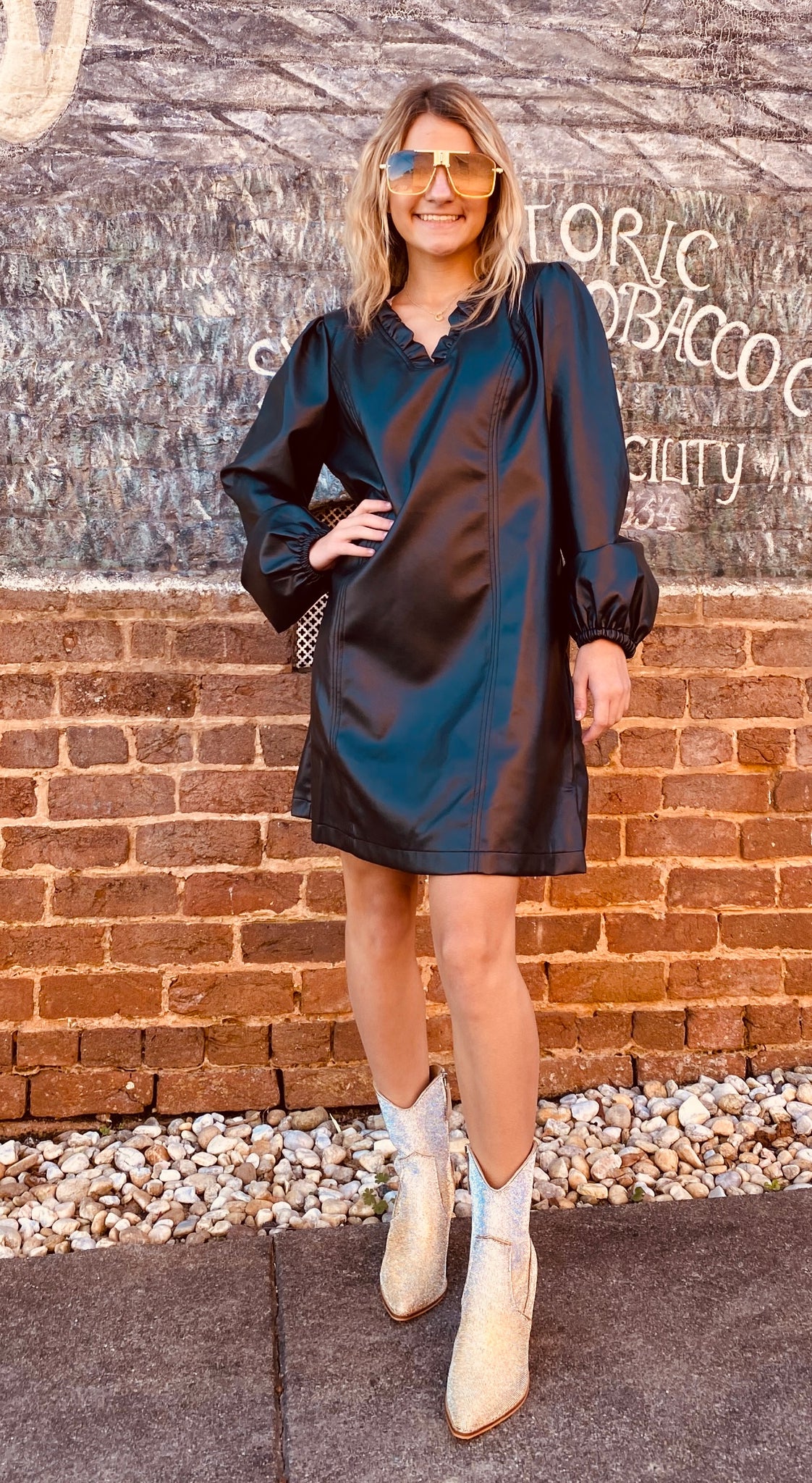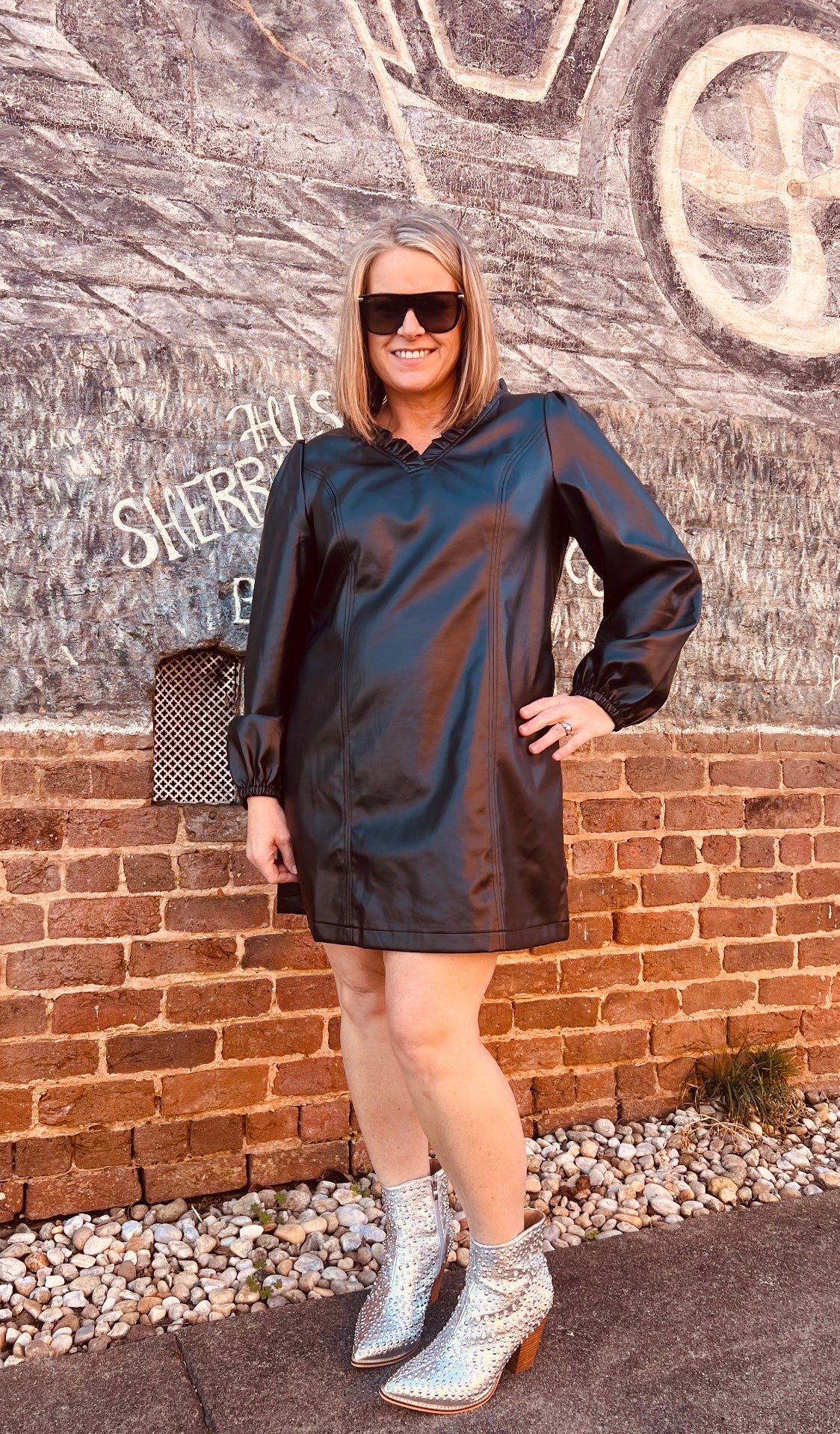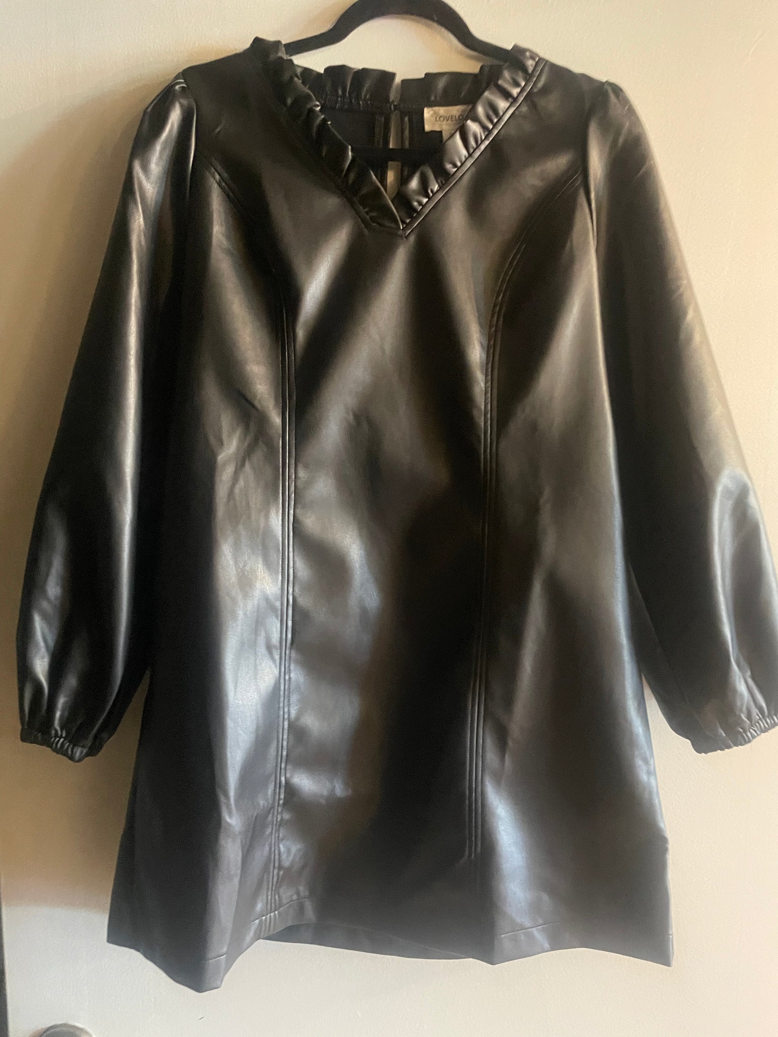 Introducing Party with Me - the perfect knee length occasion dress made with black faux leather. Experience the ultimate in comfort and style with this must-have piece in your party wardrobe. With its sleek design, be the center of attention at any event. V-neck and has pockets.