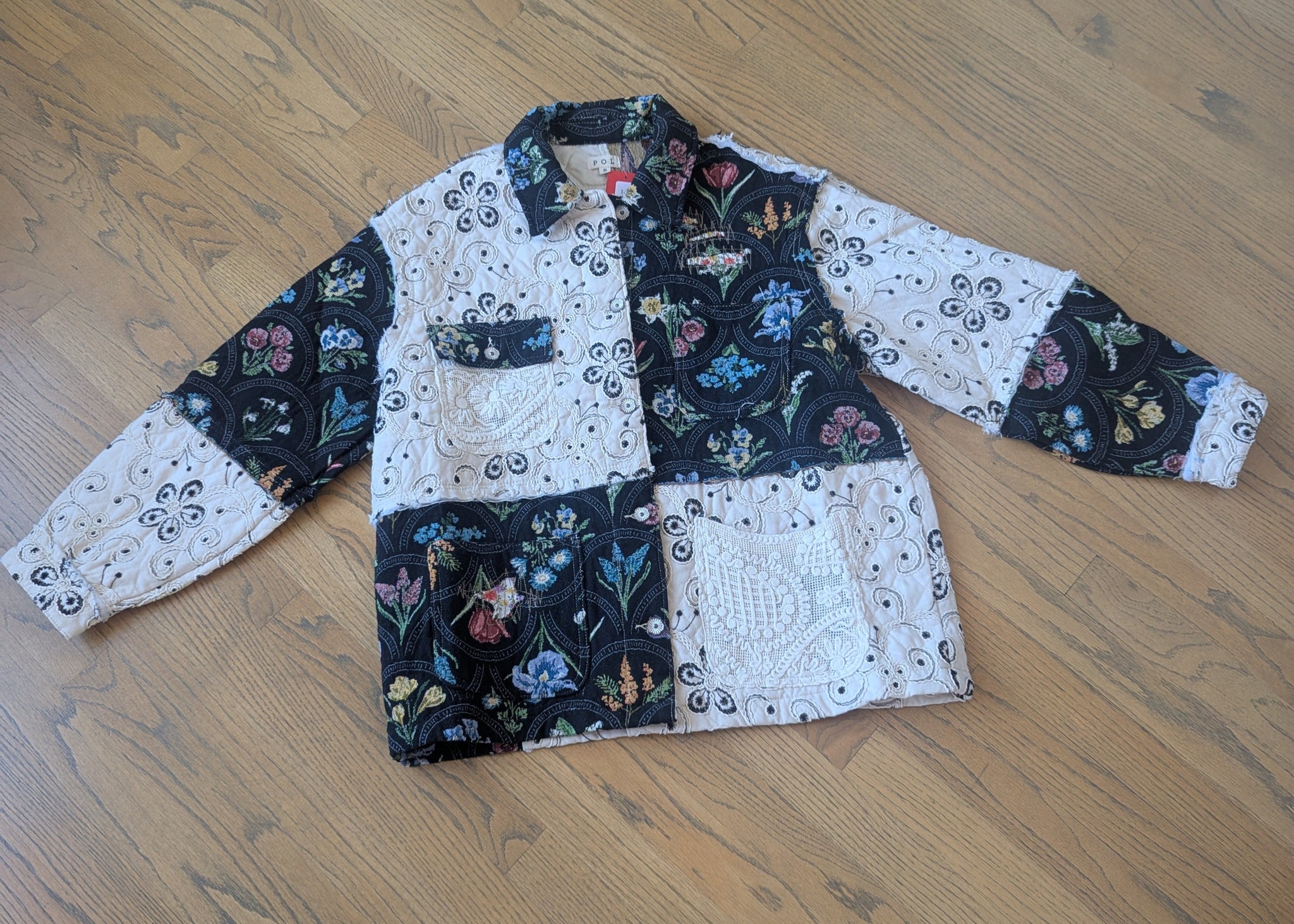 This playful top features a relaxed fit and charming balloon sleeves, crafted from a soft jacquard blend of polyester and cotton. Its unique pointed floral pattern with raw edge details adds a touch of whimsy to your wardrobe, making it both comfortable and effortlessly stylish for any casual outing.